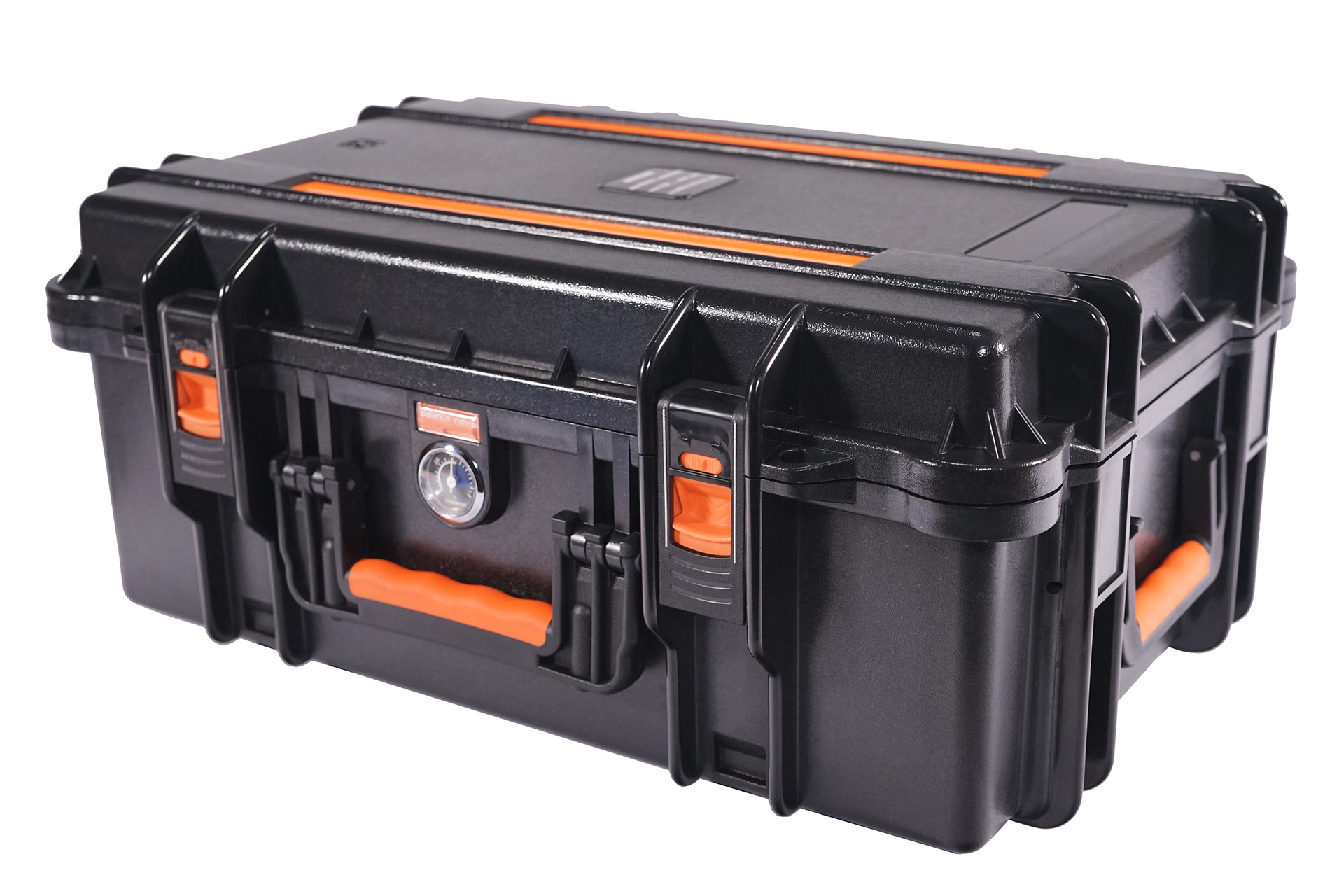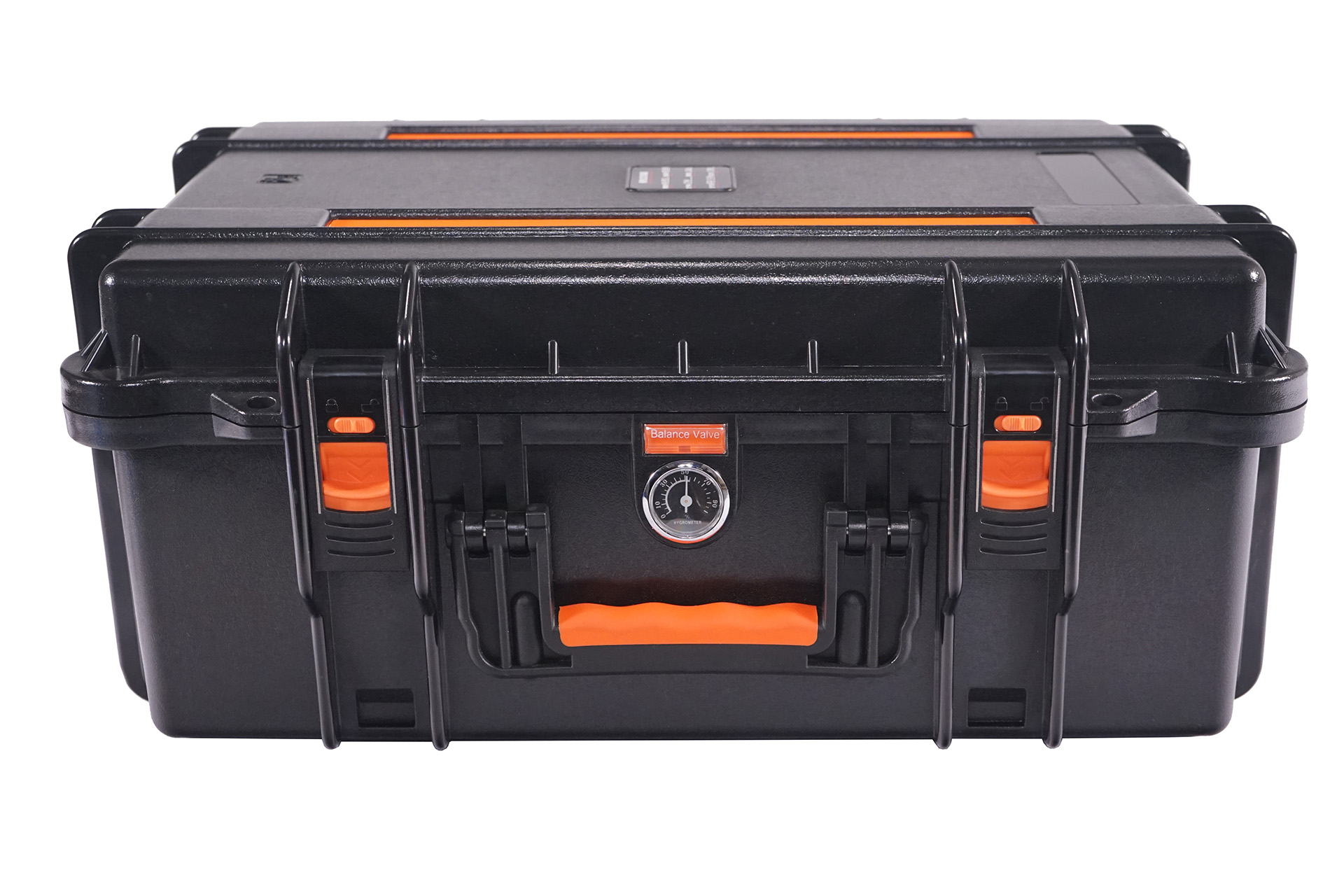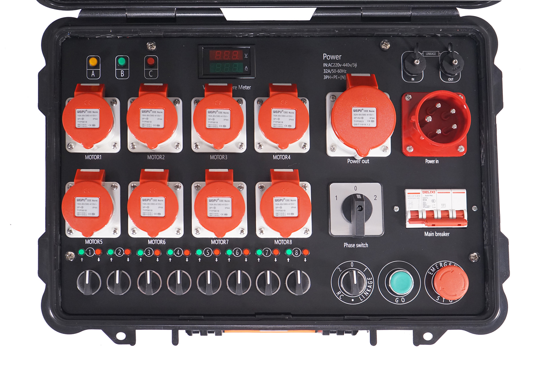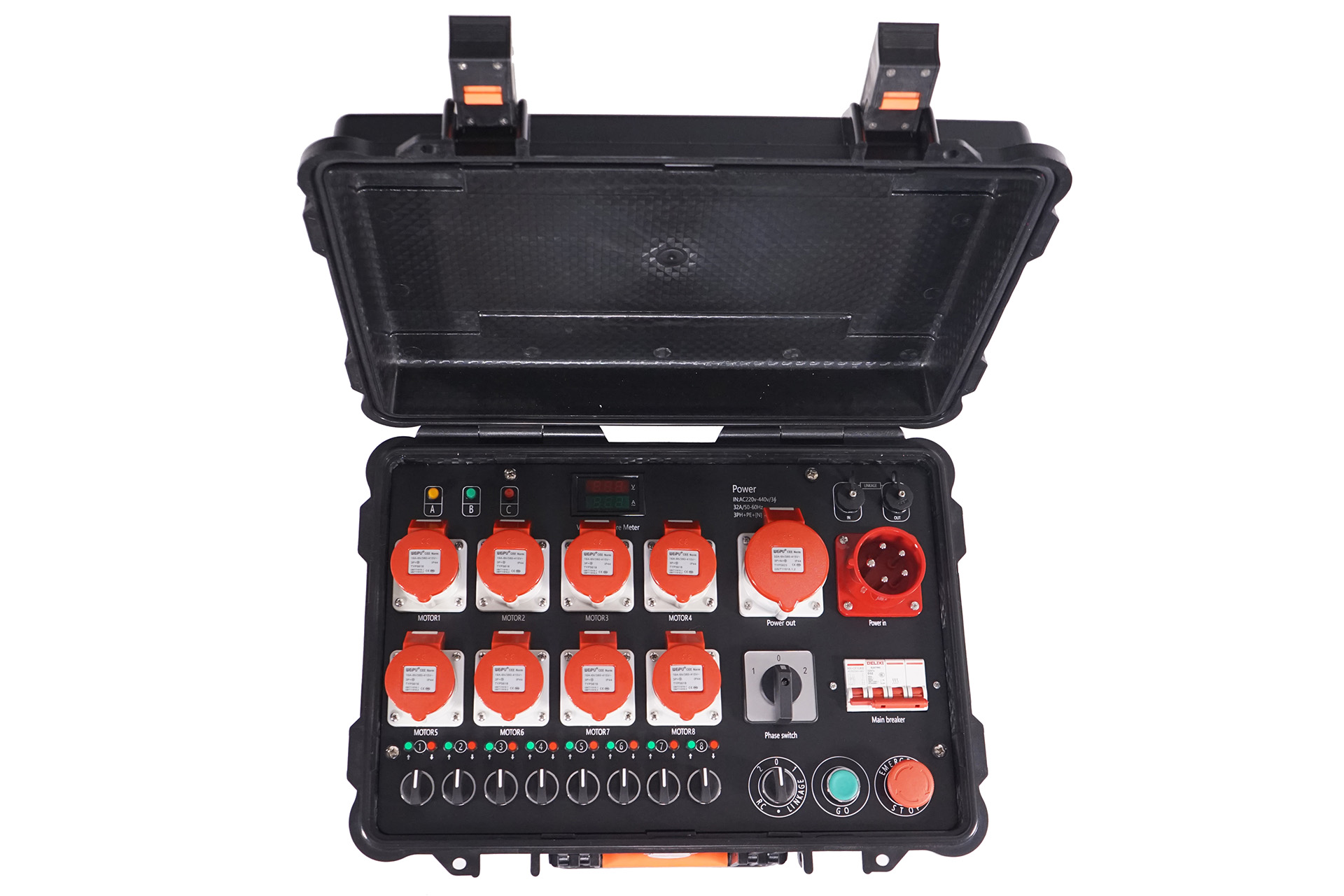 Centralina di controllo portatile a 8 vie per motore elettrico, con flight case integrato, pulsanti di emergenza, alimentazione e funzionamento, interruttori di controllo del sollevamento.
