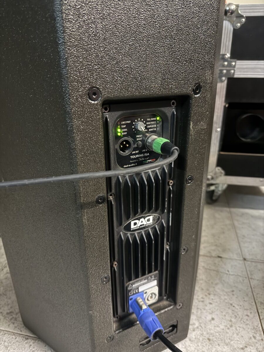 Vendesi coppia di altoparlanti Dad Touring 15P. Casse attive 15” e bobina da 3” con finale di potenza powersoft 1400 watt 128 db. Peso 30 kg. Le casse sono sempre state utilizzate con cover. ( le cover sono rovinate) .