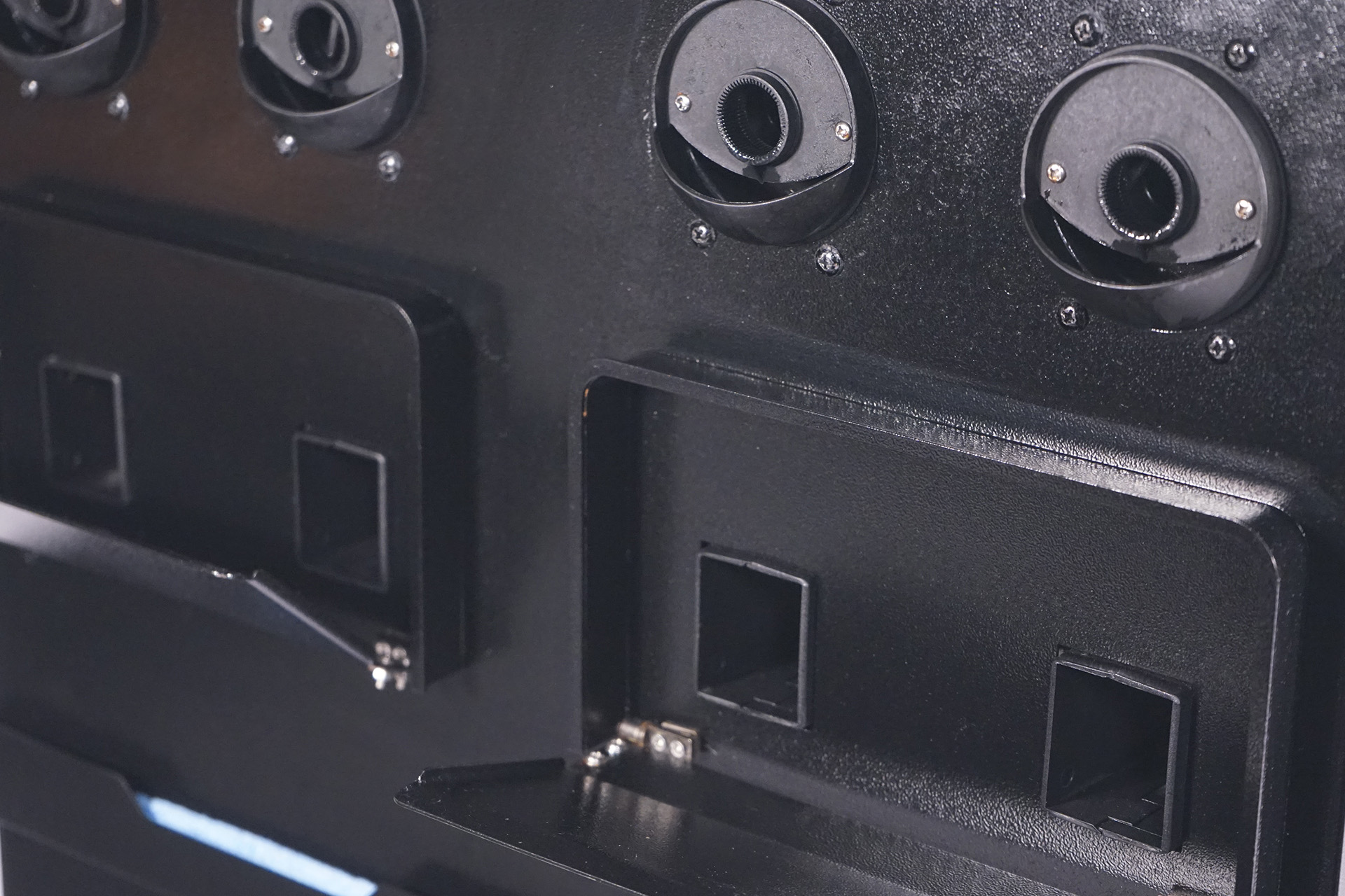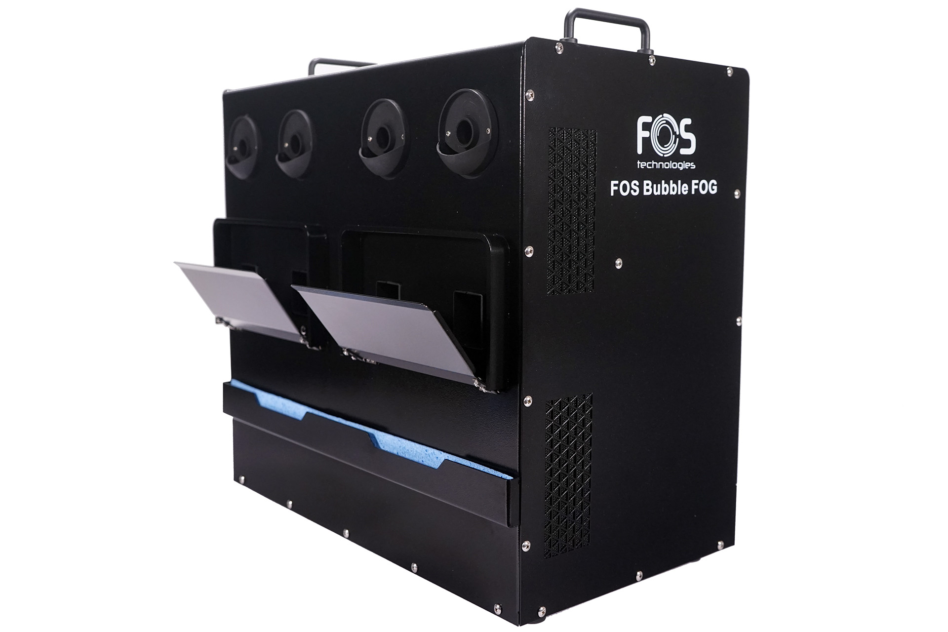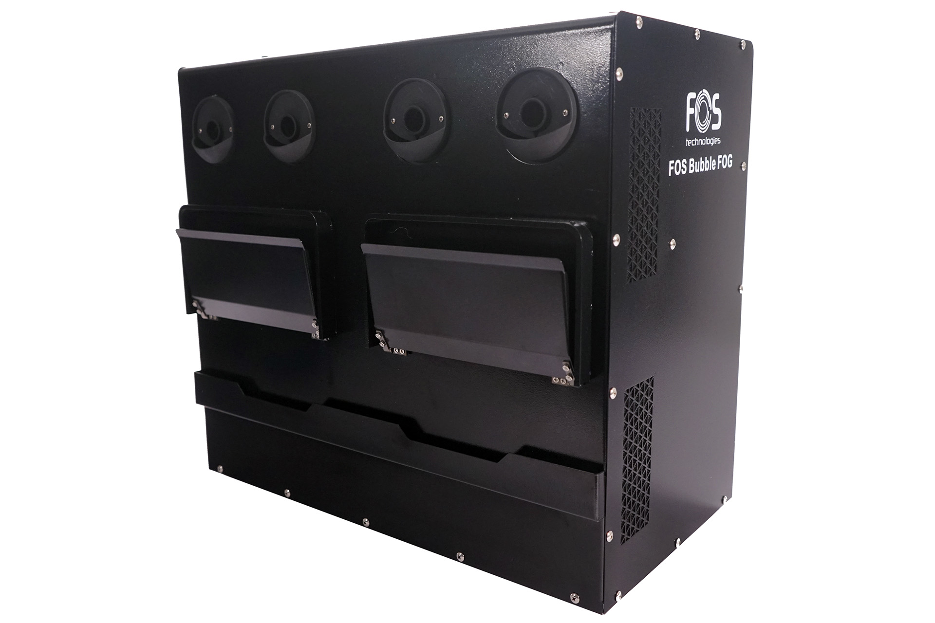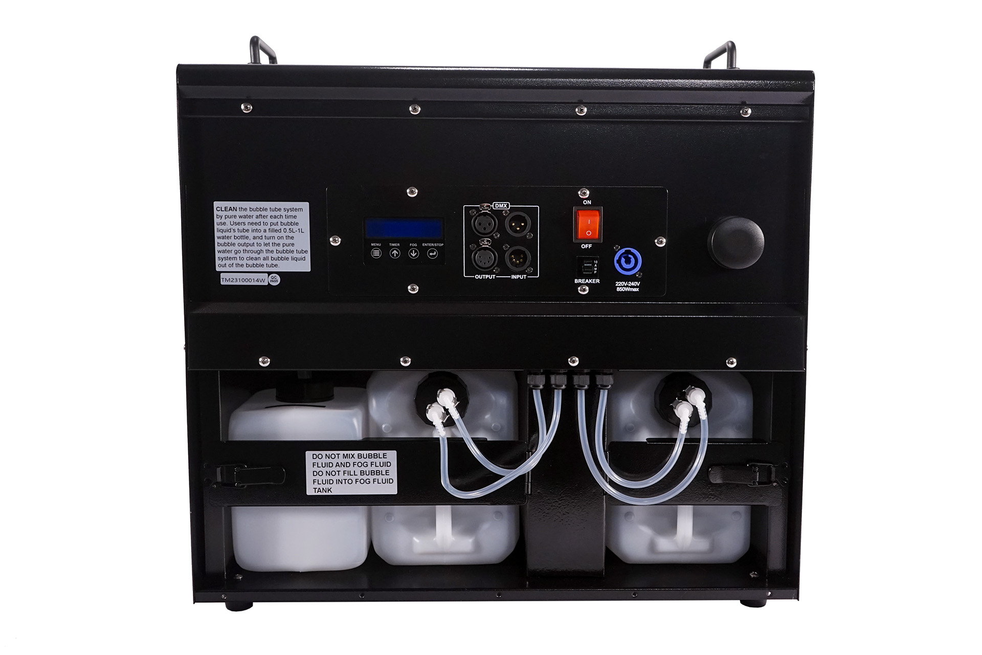 Potente macchina combinata per bolle e nebbia/foschia con 4 ugelli di uscita, ogni effetto può essere utilizzato singolarmente o combinato per produrre bolle piene di nebbia, 4 ventole per soffiare bolle e/o fumo a metri di distanza, 4 canali DMX, tempo di riscaldamento: 4 min, capacità del serbatoio: serbatoio per fluido nebbia da 2,5 l, 2 serbatoi per bolle e nebbia da 5 l, telecomando wireless, utilizza liquido per bolle e liquido per nebbia a base d’acqua standard, 22 kg.