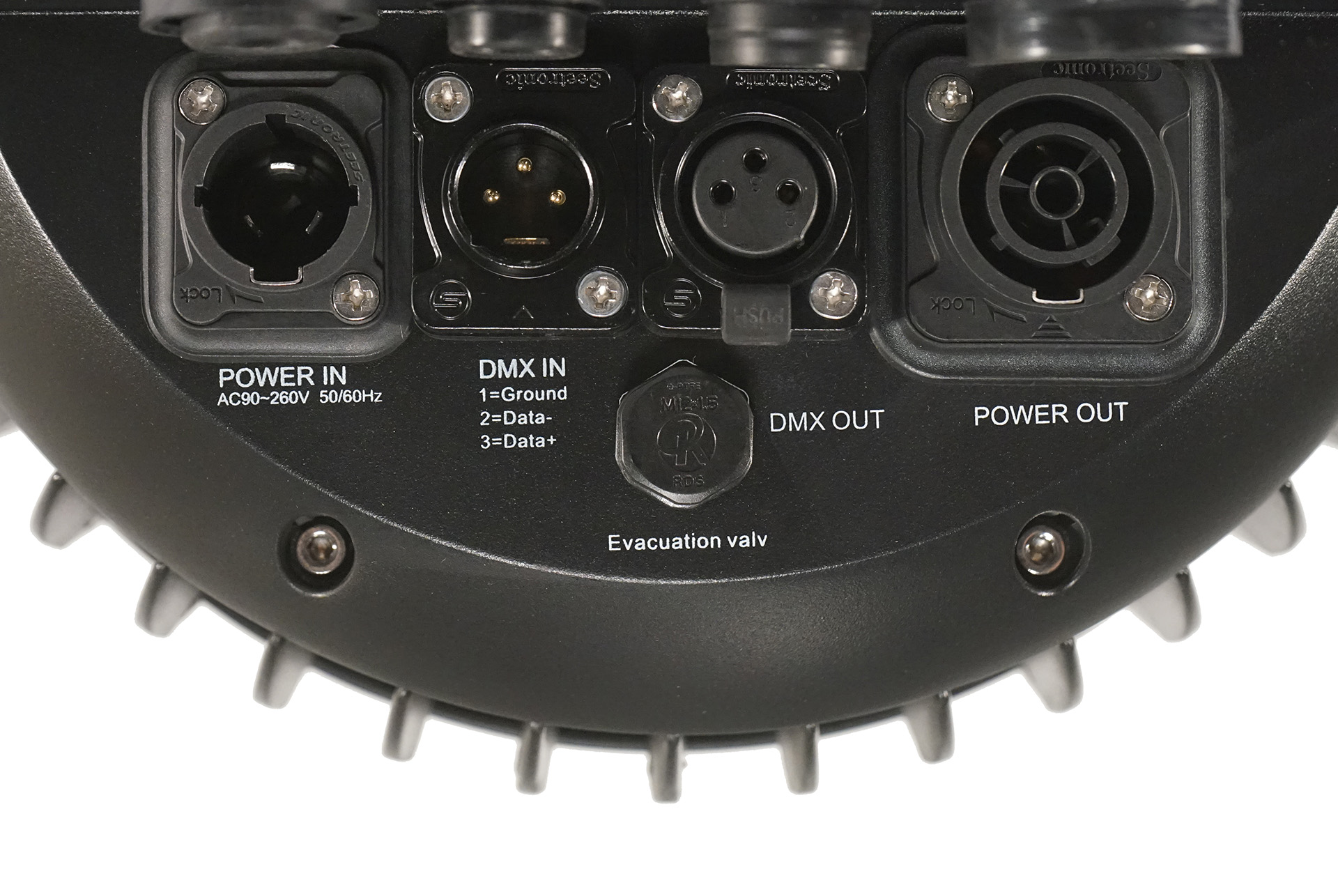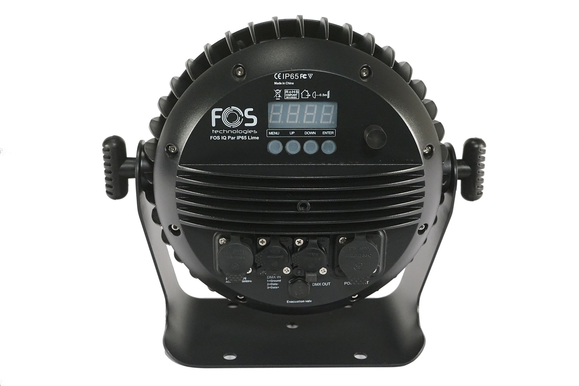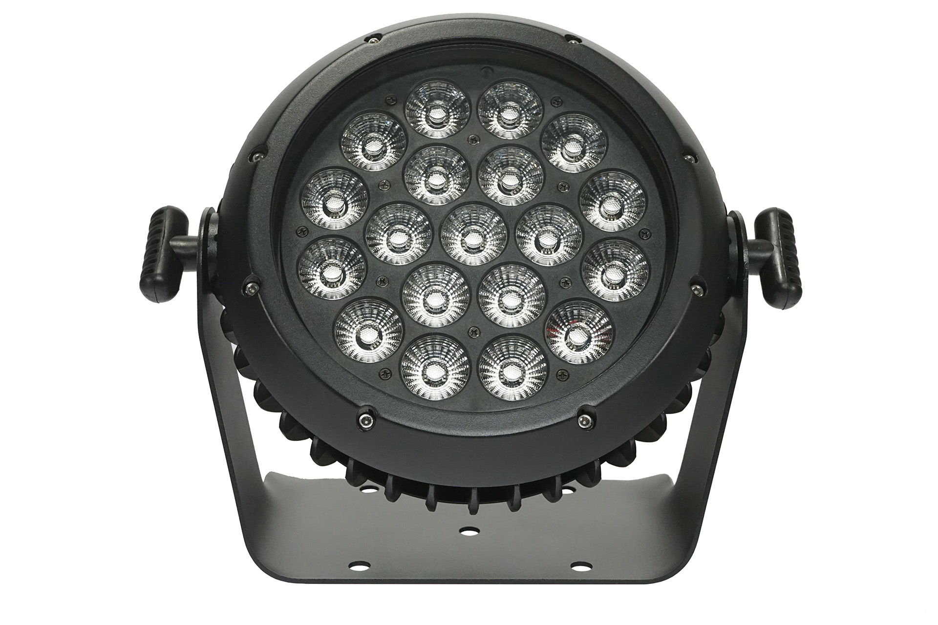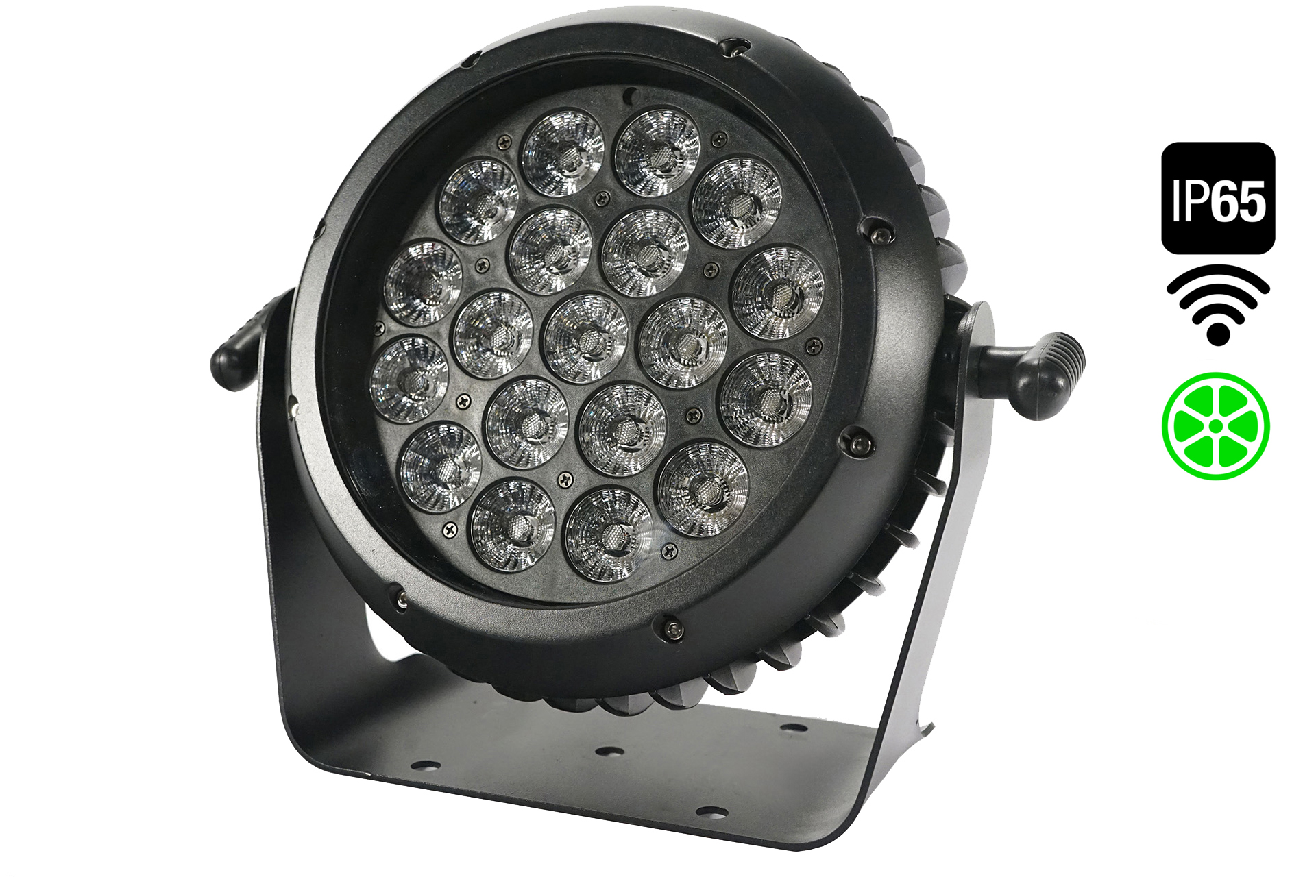 Contemporary IP65 led par with Wireless DMX operation and amazing color mixing, 19 LEDS 12 watts RGB + LIME , 26 degrees beam angle, 0-100% linear dimmer, flicker-free, 3 pixels rings, strobe effect with 1-25T /s, 22/10 DMX channel, IP rated power and DMX connector IN/OUT, Dual mounting brackets for installation/floor stand, Built, noise-free aluminum cooling system, built-in programs, and macro effects. 4.7 kg