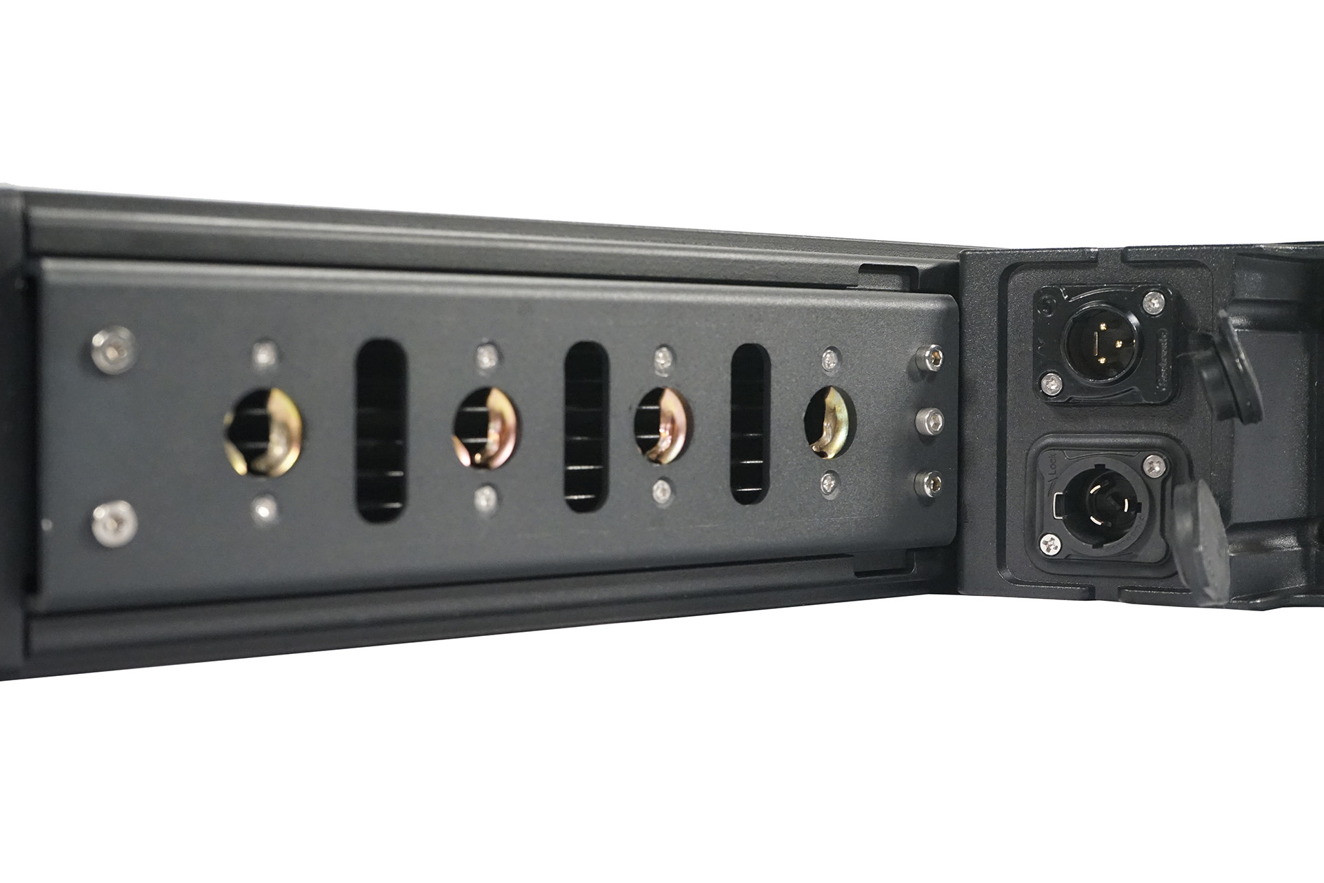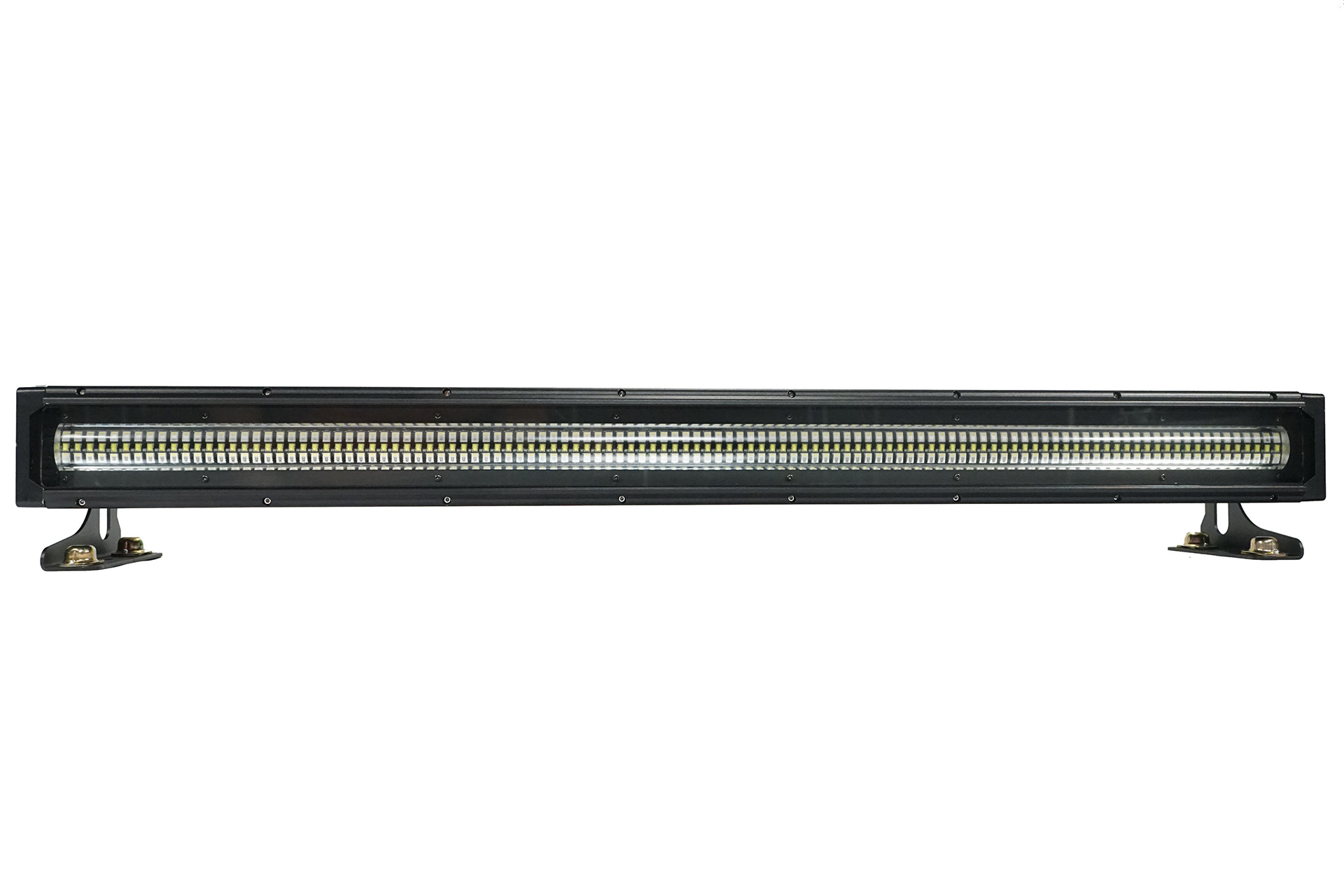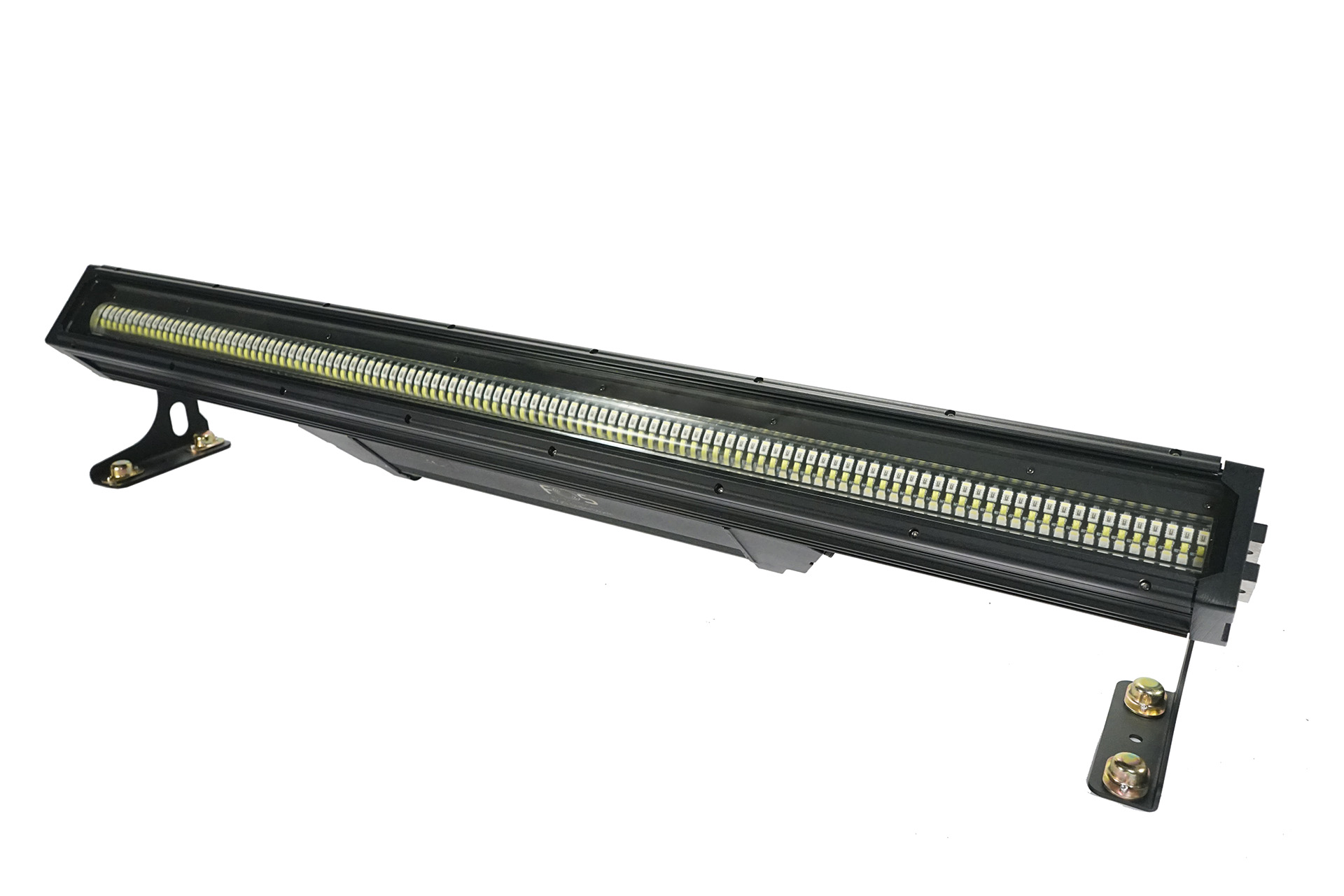 Barra stroboscopica a LED IP65, ultra luminosa 144x5W bianco freddo 7000K su segmenti da 16 pixel, 242x2W RGBW su segmenti da 32 pixel (2×16), modalità DMX: 13, 64 e 89 canali, angolo di campo: 90°, dimmer lineare 0-100, strobo 0,3-20 impulsi/sec, max 20Hz. Connettori di alimentazione Seetronic e XLR resistenti alle intemperie, 700 watt, 100 cm, 9 kg.