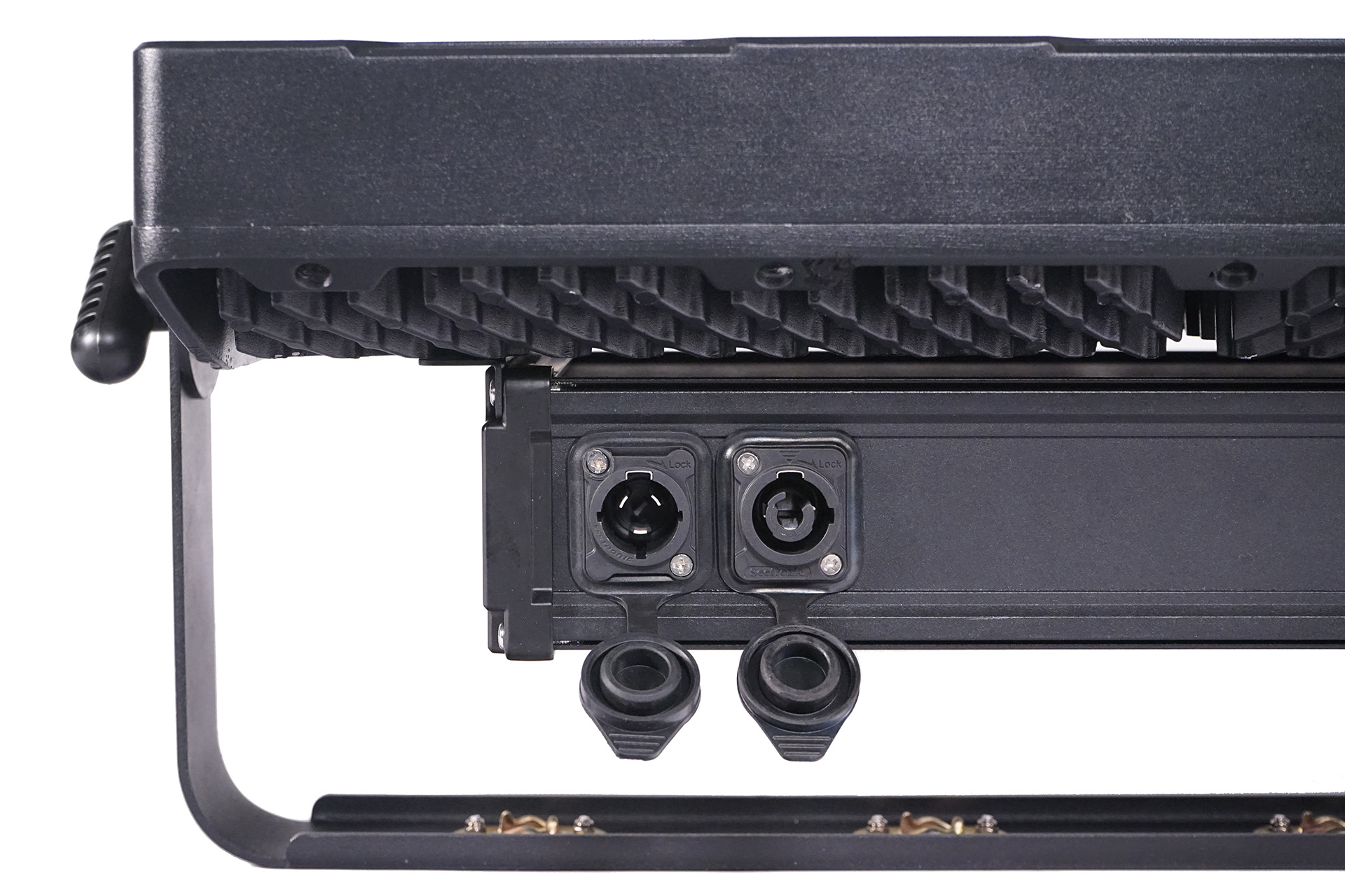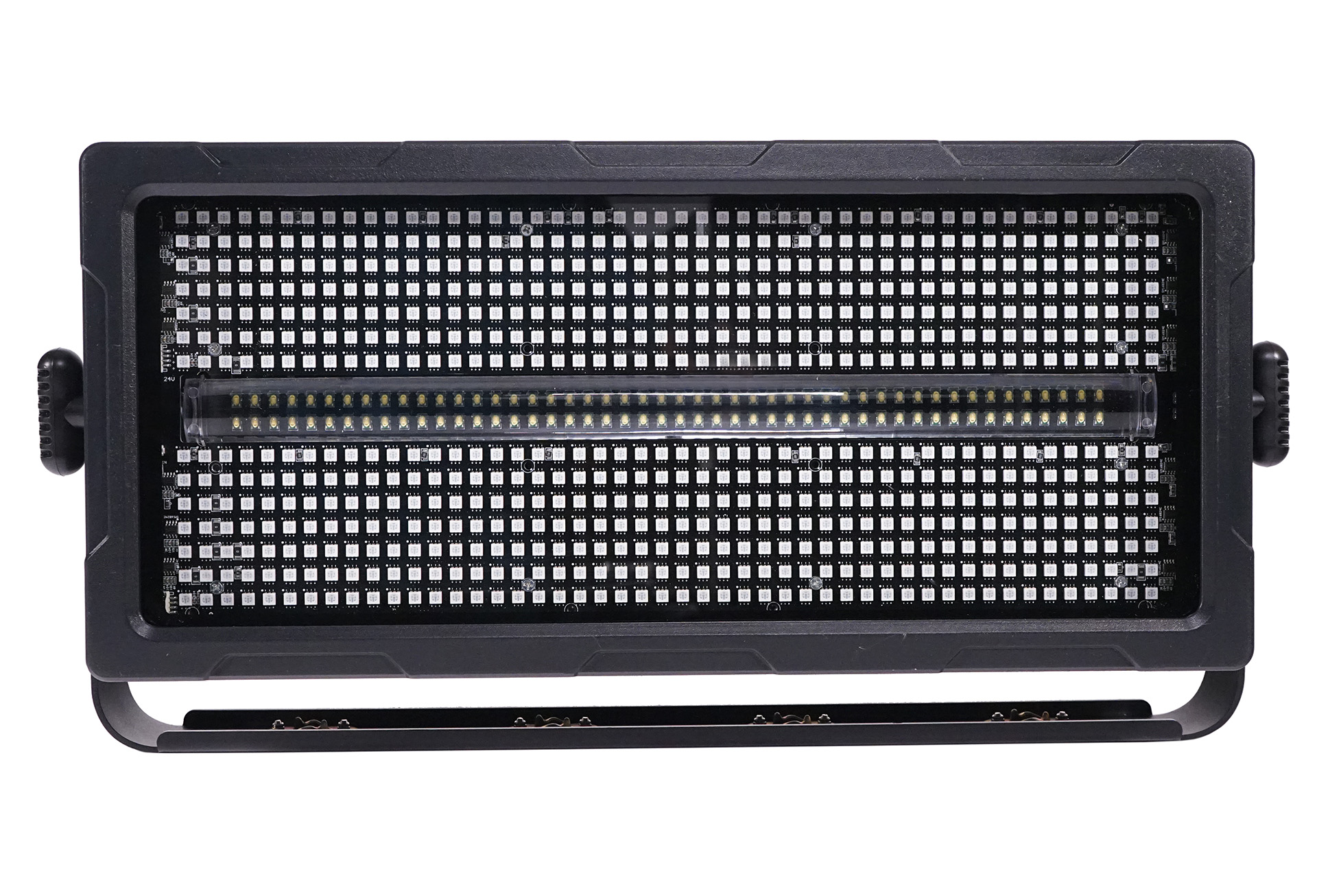 Strobo innovativo multiuso IP65 per applicazioni esterne e interne, totale 24 pixel completamente controllabili, 8 pixel accecanti da 96 LED bianco freddo 5 watt e 16 pixel di pittura a colori da 672 LED SMD RGB da 0,3 watt, angolo del fascio: 120°, canali DMX: 12/59ch, resistente alle intemperie IP65, connettori XLR e PowerCON Seetronic, display OLED, 9,5 kg